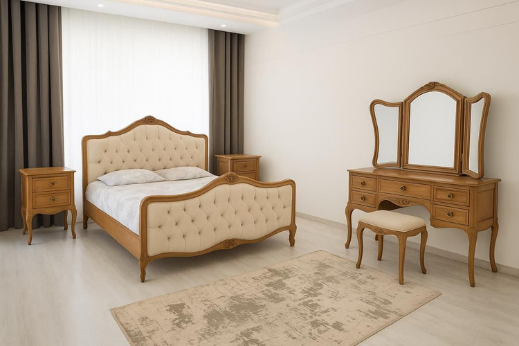 سرویس خوابی که هر روز صبح حسوحال یه هتل پنجستاره رو میده، ترکیب چوب طبیعی + لمسهدوزی ظریف = یه سرویس که هم گرم و آرومه، هم شیک و ماندگار.